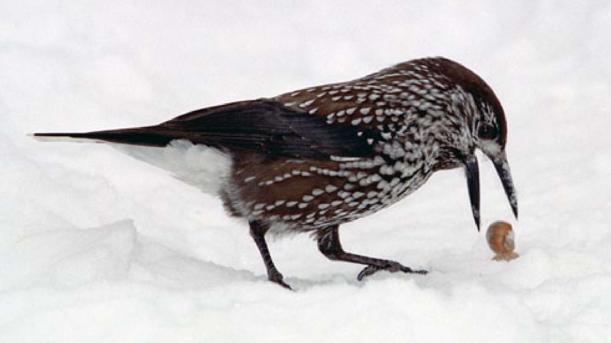 Разные птицы в Москве зимуют. О воробьях, домовых и полевых, галках, воронах и голубях разговора нет. Эти в городе и зимой и летом у себя дома. Поздней осенью и ранней весной свиристели на город набеги совершают. Обдерут ягоды на рябинах и боярышнике и дальше в путь, осенью на зимовку, весной в тайгу, на родину. Случается, что дрозды рябинники нагрянут ненадолго. Кончились ягоды, и они пропали, как будто их и не было вовсе. Только остатки «битой» рябины на снегу напоминают до первых обильных снегопадов об их недавнем присутствии в городских скверах и парках. Грачи на помойках по московским дворам - не редкость. Зеленушки кое-где на подкормке всю зиму держатся. Но это все картины обычные для большого города. Но бывают в Москве совсем редкие гости. Залетают изредка малиновые, с жемчужным проблеском, щуры. А тут и вовсе необычные визитеры случились. Обосновались на зиму в различных московских парках кедровки, большие охотницы до орехов. За это их еще ореховками называют. За одной такой ореховой лакомкой довелось мне наблюдать в Лосином острове. Дело было в конце января. Пришли мы с товарищем, тоже любителем фотографировать птиц, на птичью подкормку. Утро, люди с кормом еще не подтянулись, птицы голодные. Большие синицы скачут вокруг, в глаза заглядывают, что принесли, чем кормить будут? Насыпали семечек, товарищ крошеного яйца добавил, сухой рис положил. Рис, как ни странно местная пищуха пристрастилась таскать и прятать в трещинах коры. На тропинку, где снег утоптан, орехов положили для белок и соек. Они тут же, неподалеку, крутятся. Белки, доверчивей, подбегают близко. Сойки же осторожничают, с соседних деревьев, на отшибе наблюдают за подкормкой. Изредка схватит птица, какая пошустрее, кусок хлеба и летит подальше, в снегу прятать, на черный день запас делает. Чуть позже появился поползень. Потом пищуха, любительница риса явилась. Покрутилась у кормушки и исчезла, что-то ей не понравилось.
