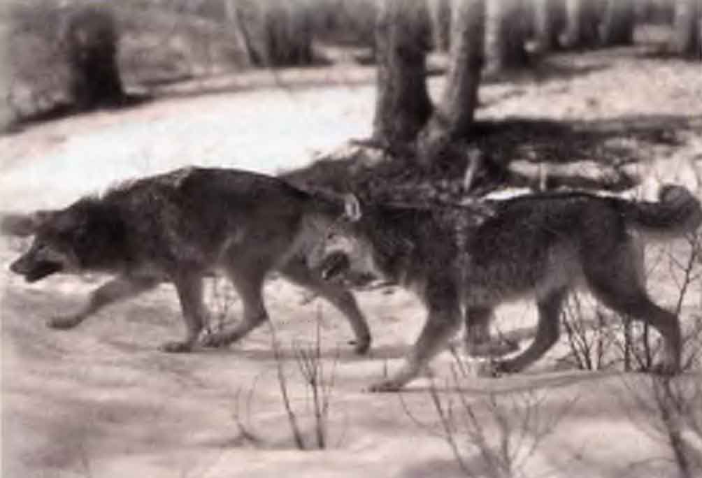 Весна торопилась. Солнце с каждым днем поднималось выше над горизонтом, снег оседал под его лучами. Вокруг деревьев образовались воронки от просевшего снега. По ночам еще случались заморозки, и снег покрывала корка наста. Матерый и волчица спустились с гор. Они шли по незнакомой местности, изрезанной логами, заросшими лиственным лесом и кустарниками. На равнине раскинулись поля с многочисленными березовыми колками. Далеко остались горы с их охотничьим участком и логовом, в котором несколько лет выводили потомство. Волки боялись мести людей и подыскивали в предгорье удобное место для охоты и устройства логова. Позавчера волчица успешно нагнала на вожака табун косуль. За два дня от добытой косули, кроме клочьев шерсти, ничего не осталось.